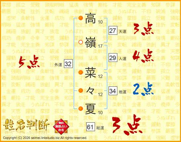 高(10画)嶺(17画) 菜(12画)々(12画)夏(10画)