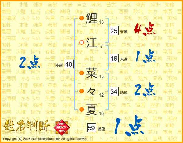 鯉(18画)江(7画) 菜(12画)々(12画)夏(10画)