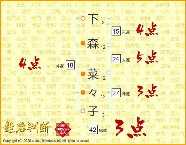 下(3画)森(12画) 菜(12画)々(12画)子(3画)