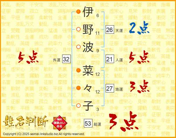 伊(6画)野(11画)波(9画) 菜(12画)々(12画)子(3画)