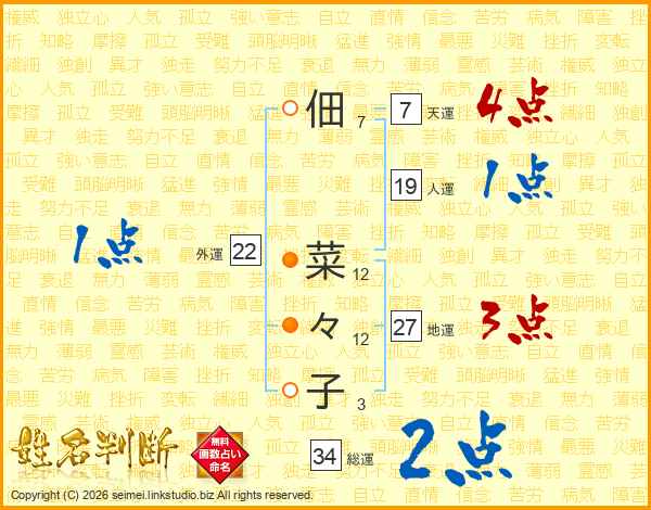 生活面を象徴する運勢です。外部から受ける影響力を表し、結婚運、家庭運や職場、環境への順応性を表します。総運から人運を引いた画数。姓や名が1文字の場合を除く。