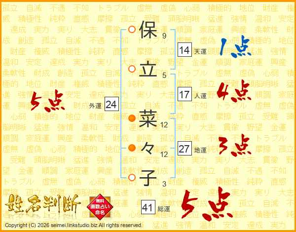 保(9画)立(5画) 菜(12画)々(12画)子(3画)