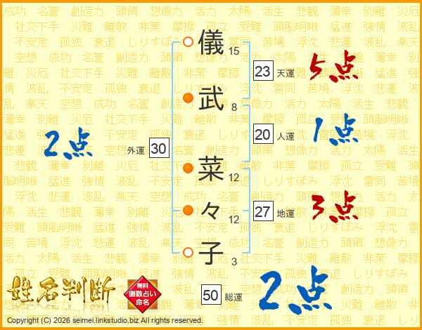 儀(15画)武(8画) 菜(12画)々(12画)子(3画)