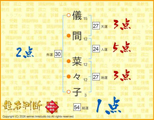 儀(15画)間(12画) 菜(12画)々(12画)子(3画)
