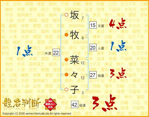 坂(7画)牧(8画) 菜(12画)々(12画)子(3画)