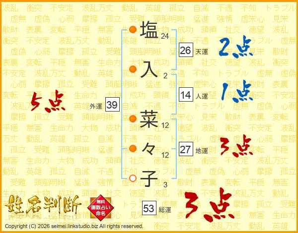 塩(24画)入(2画) 菜(12画)々(12画)子(3画)