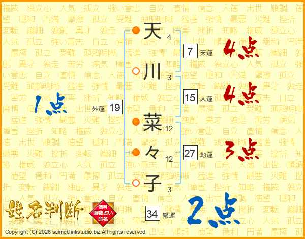 天(4画)川(3画) 菜(12画)々(12画)子(3画)