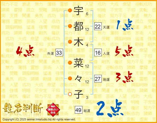 宇(6画)都(12画)木(4画) 菜(12画)々(12画)子(3画)