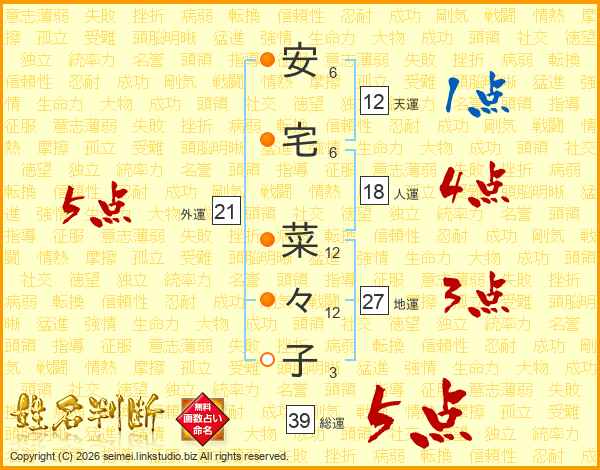 安(6画)宅(6画) 菜(12画)々(12画)子(3画)