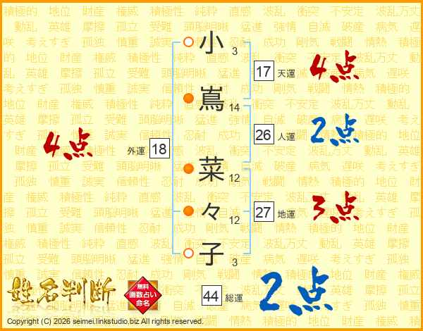 小(3画)嶌(14画) 菜(12画)々(12画)子(3画)
