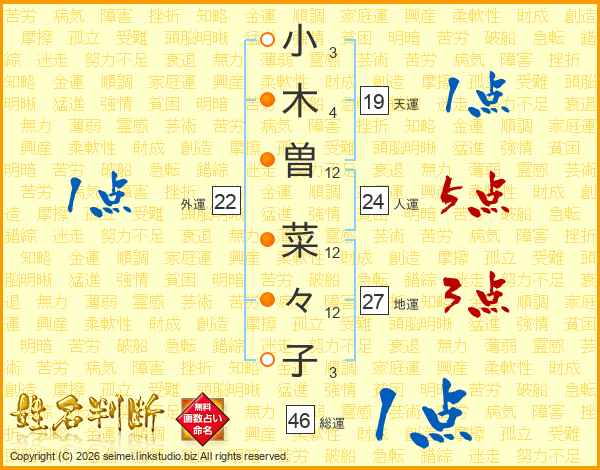 小(3画)木(4画)曽(12画) 菜(12画)々(12画)子(3画)