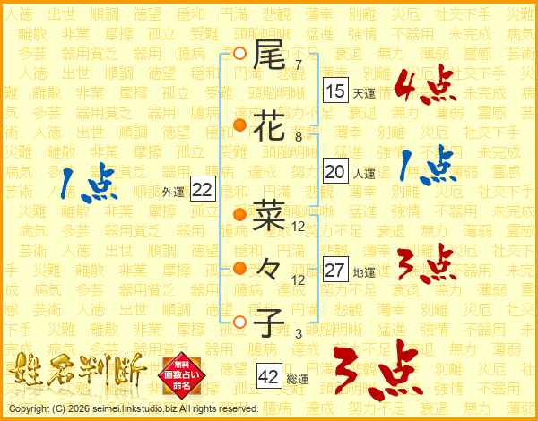 尾(7画)花(8画) 菜(12画)々(12画)子(3画)