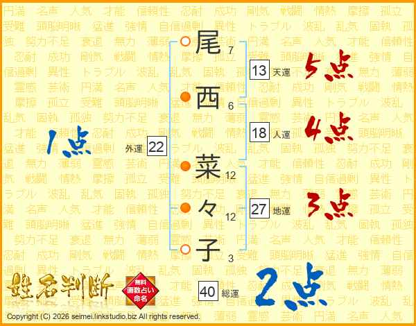 尾西菜々子さんの天運は13画の5点!