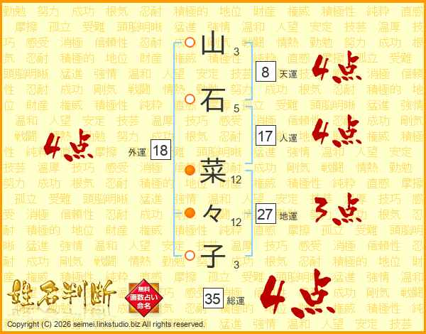 山(3画)石(5画) 菜(12画)々(12画)子(3画)