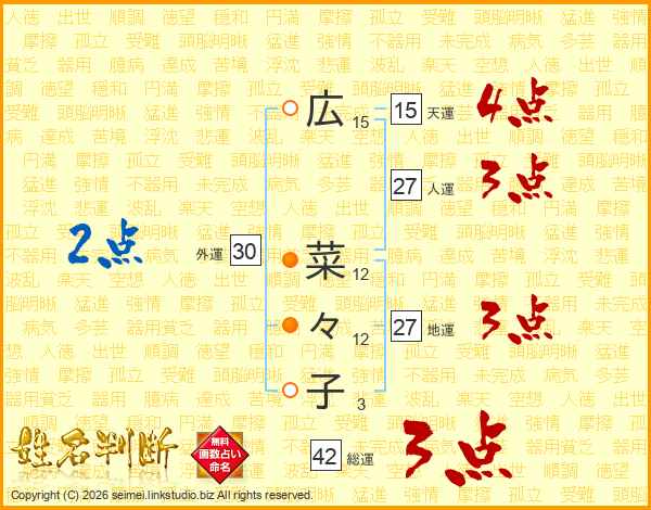 生活面を象徴する運勢です。外部から受ける影響力を表し、結婚運、家庭運や職場、環境への順応性を表します。総運から人運を引いた画数。姓や名が1文字の場合を除く。
