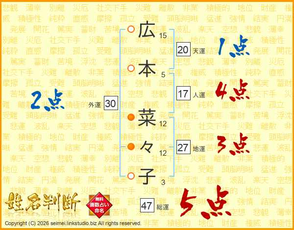 広(15画)本(5画) 菜(12画)々(12画)子(3画)