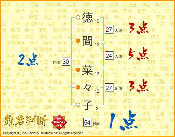 徳(15画)間(12画) 菜(12画)々(12画)子(3画)
