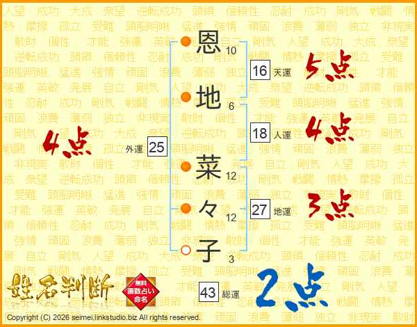 恩(10画)地(6画) 菜(12画)々(12画)子(3画)