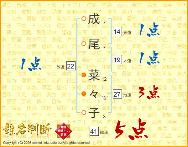 成(7画)尾(7画) 菜(12画)々(12画)子(3画)