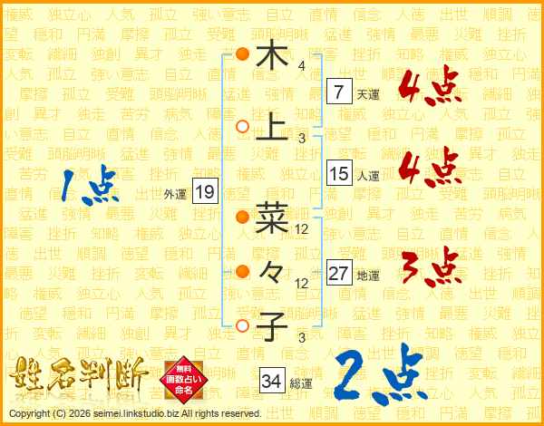 木(4画)上(3画) 菜(12画)々(12画)子(3画)
