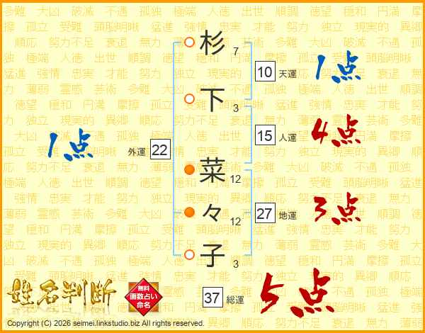 杉下菜々子さんの総運は37画の5点!