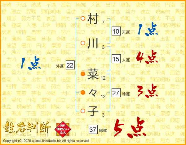 村(7画)川(3画) 菜(12画)々(12画)子(3画)