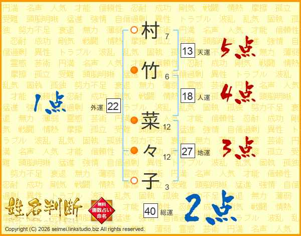 村(7画)竹(6画) 菜(12画)々(12画)子(3画)