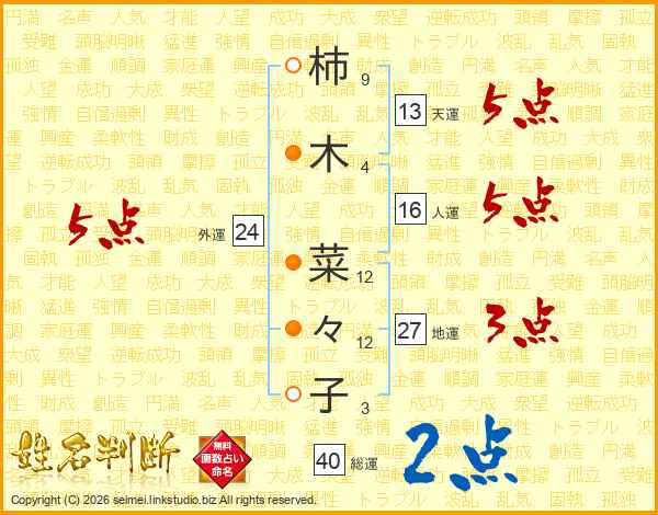 柿(9画)木(4画) 菜(12画)々(12画)子(3画)