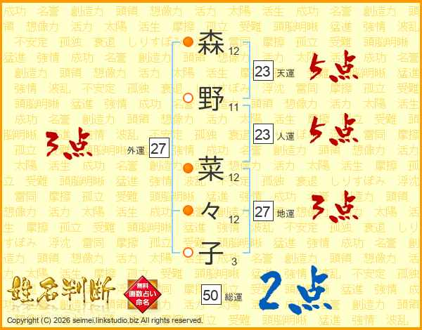 森(12画)野(11画) 菜(12画)々(12画)子(3画)