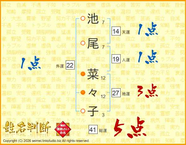 池(7画)尾(7画) 菜(12画)々(12画)子(3画)