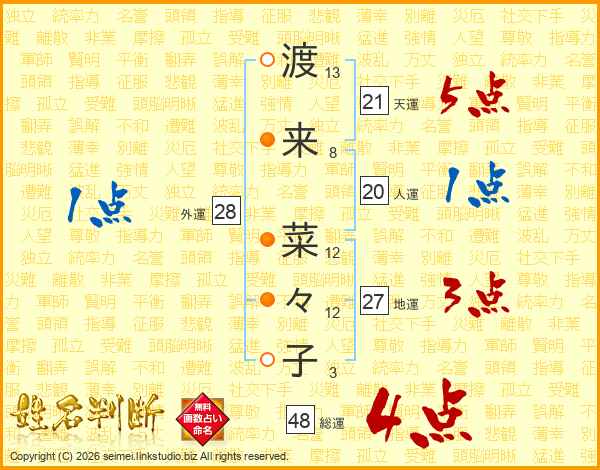 渡(13画)来(8画) 菜(12画)々(12画)子(3画)