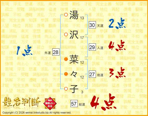 湯(13画)沢(17画) 菜(12画)々(12画)子(3画)