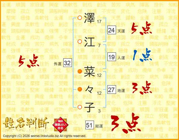 澤(17画)江(7画) 菜(12画)々(12画)子(3画)