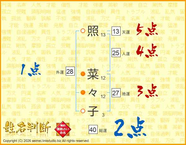 照(13画) 菜(12画)々(12画)子(3画)