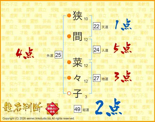 狭(10画)間(12画) 菜(12画)々(12画)子(3画)