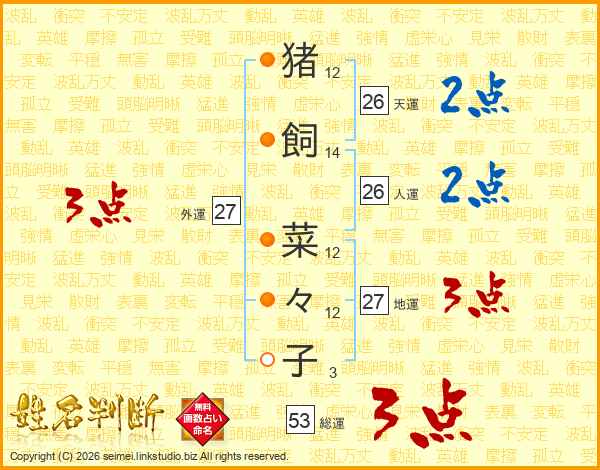 猪(12画)飼(14画) 菜(12画)々(12画)子(3画)
