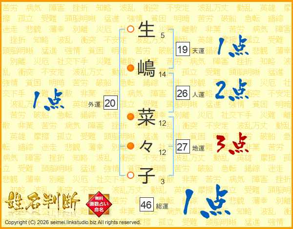 生(5画)嶋(14画) 菜(12画)々(12画)子(3画)
