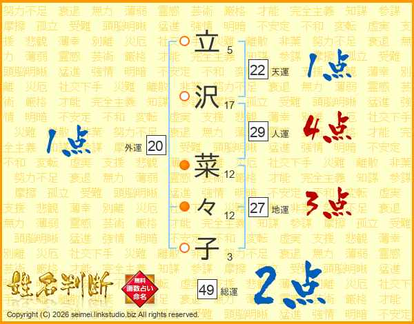 立(5画)沢(17画) 菜(12画)々(12画)子(3画)