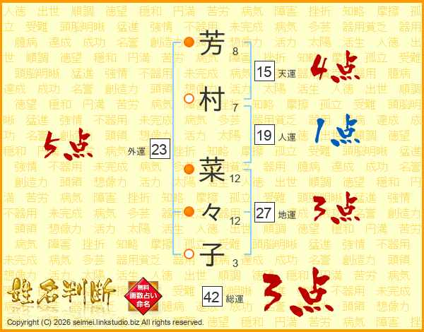 芳(8画)村(7画) 菜(12画)々(12画)子(3画)