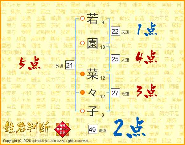 若(9画)園(13画) 菜(12画)々(12画)子(3画)