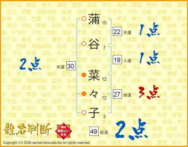 蒲(15画)谷(7画) 菜(12画)々(12画)子(3画)