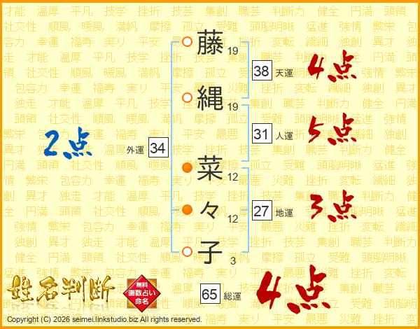 藤(19画)縄(19画) 菜(12画)々(12画)子(3画)