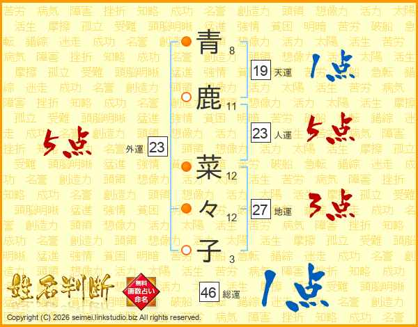 青(8画)鹿(11画) 菜(12画)々(12画)子(3画)