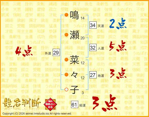 鳴(14画)瀬(20画) 菜(12画)々(12画)子(3画)