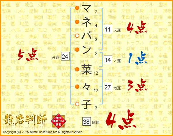 マ(2画)ネ(4画)パ(3画)ン(2画) 菜(12画)々(12画)子(3画)
