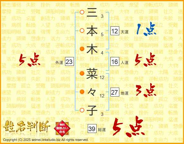 三(3画)本(5画)木(4画) 菜(12画)々(12画)子(3画)