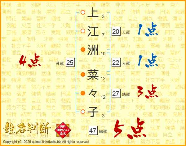 上(3画)江(7画)洲(10画) 菜(12画)々(12画)子(3画)