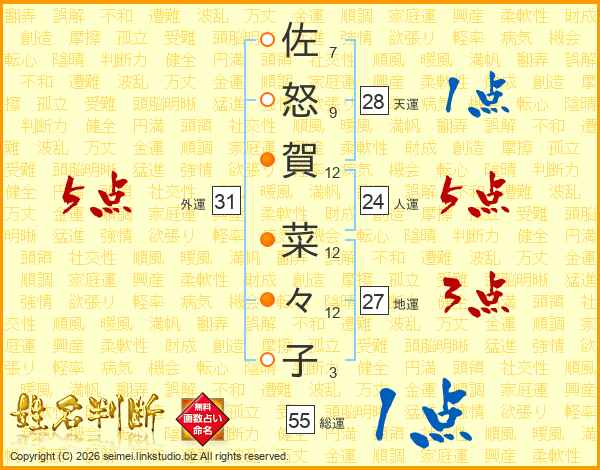 佐(7画)怒(9画)賀(12画) 菜(12画)々(12画)子(3画)