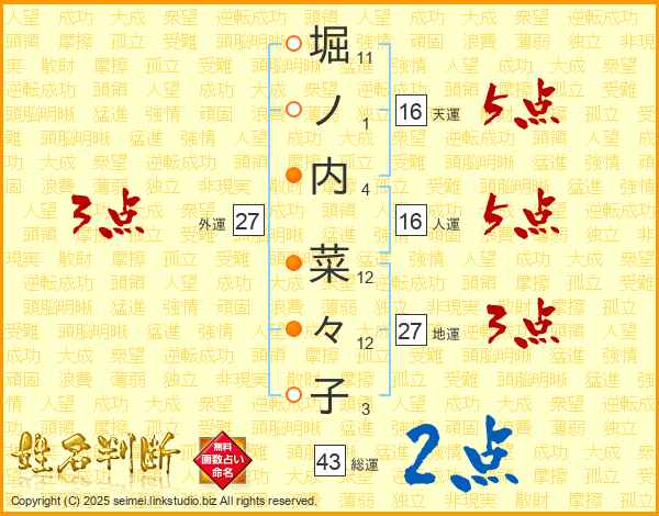 堀(11画)ノ(1画)内(4画) 菜(12画)々(12画)子(3画)