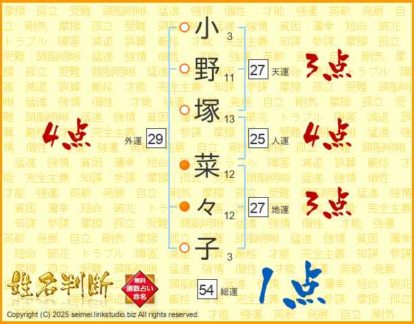 小(3画)野(11画)塚(13画) 菜(12画)々(12画)子(3画)